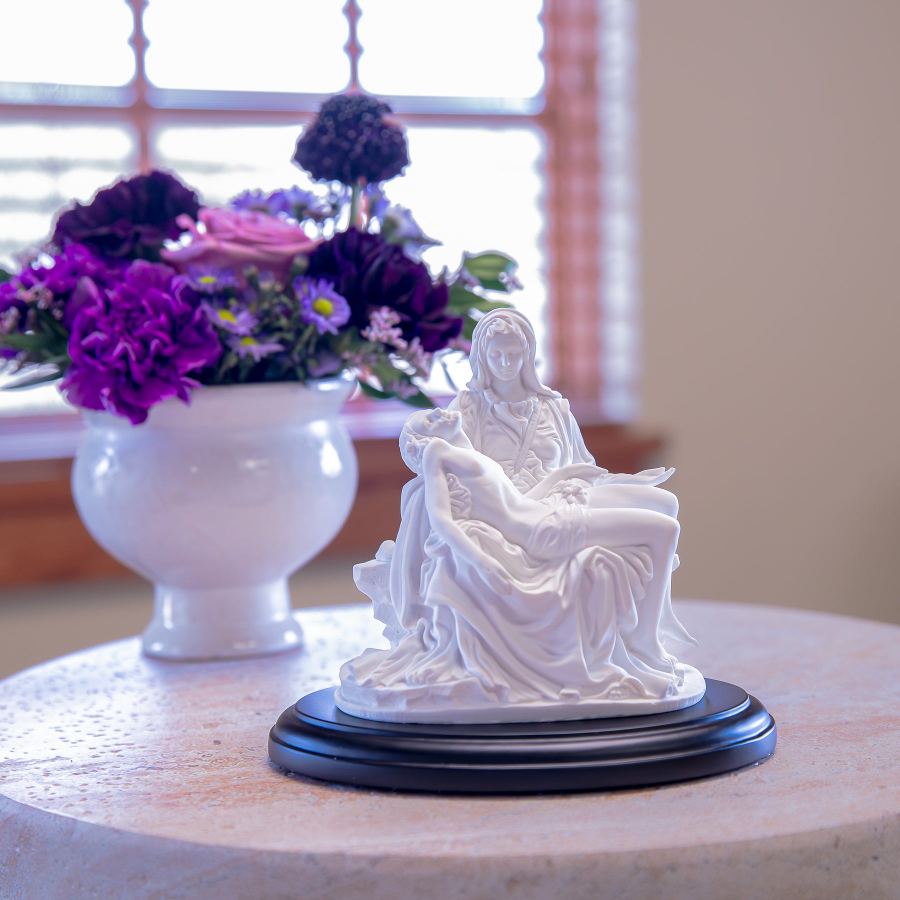 This Pieta Statue captures the tender moment of Mary holding her crucified Son with reverent detail and graceful lines. Crafted in a striking white finish atop a sleek black base, this statue blends classic devotion with contemporary elegance, making it a meaningful addition to any prayer space, mantel, or display. Its compact size allows for easy placement while serving as a lasting reminder of Christ’s sacrifice and Mary’s compassion.