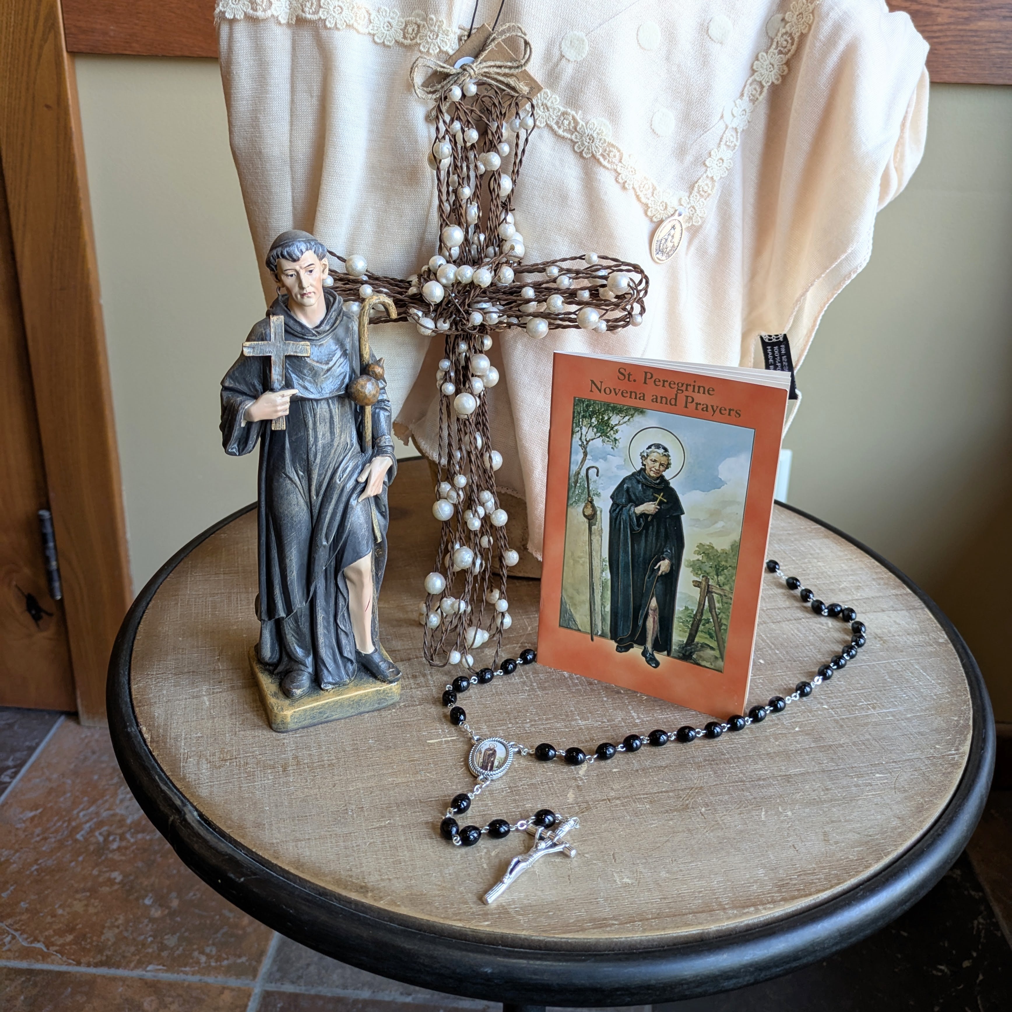 Offer that suffering prayer warrior some spiritual encouragement with a cream polka dot scarf, an eight inch statue of St Peregrine, a St Peregrine Novena booklet, a black St Peregrine Rosary, and a wire beaded hanging cross - all as pictured!